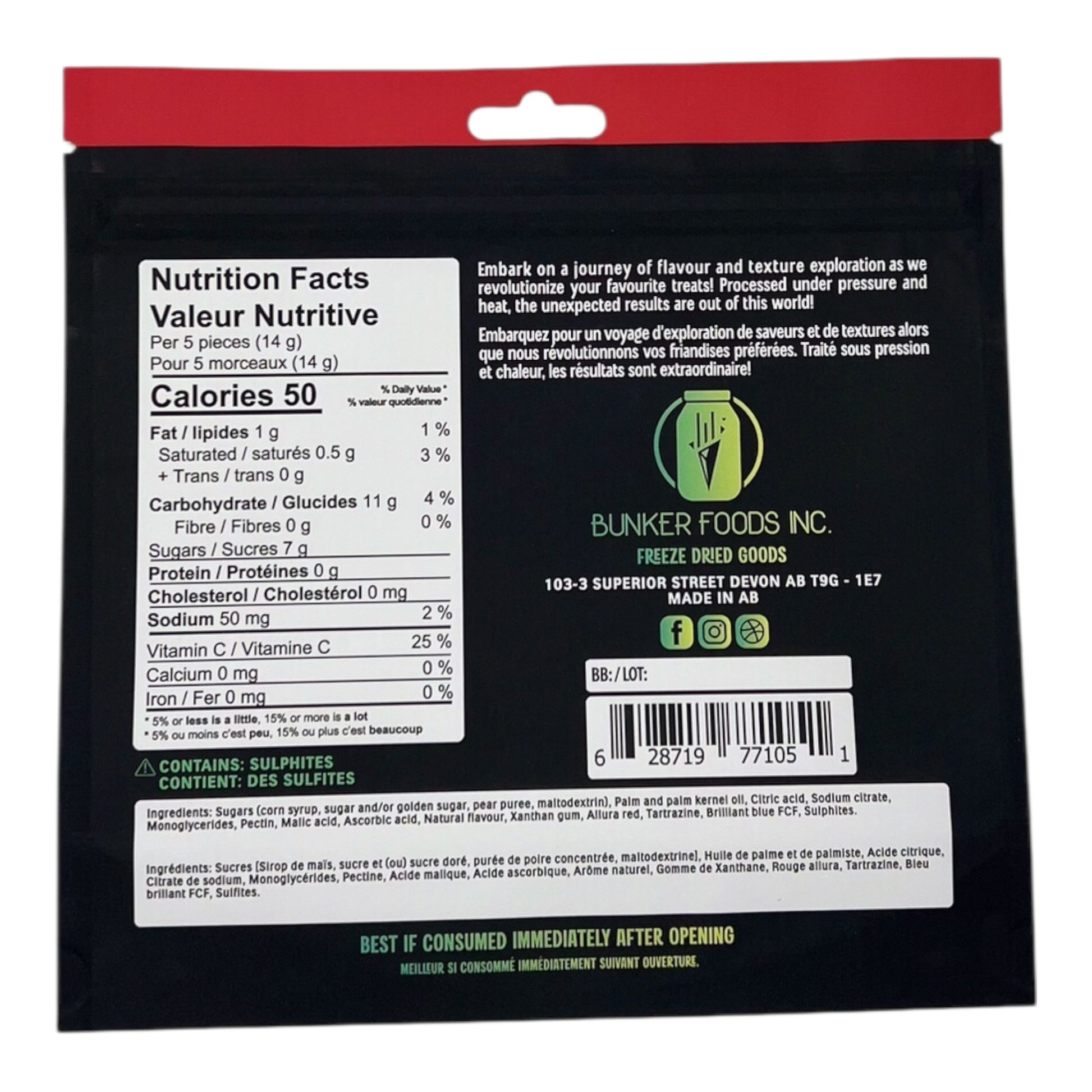 Ingredients: Corn syrup, Sugar and/or Golden sugar, Concentrated pear puree, Maltodextrin, Modified palm oil, Citric acid, Sodium citrate, Monoglycerides, Pectin, Natural flavour, Malic acid, Ascorbic acid, Acetylated monoglycerides, Xanthan gum. Colour (contains Tartrazine), Sulphites.
