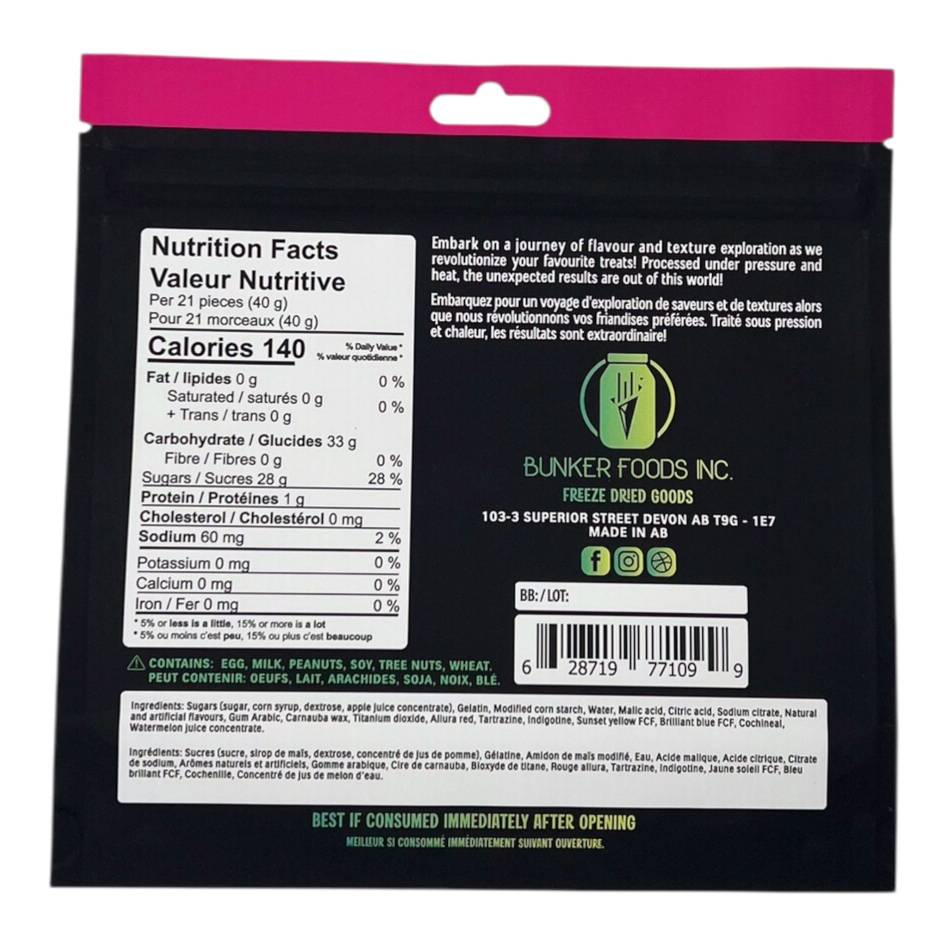 Ingredients: Sugars (sugar, corn syrup, dextrose, apple juice concentrate), Gelatin, Modified corn starch, Water, Malic acid, Citric acid, Sodium citrate, Natural and artificial flavours, Gum Arabic, Carnauba wax, Titanium dioxide, Allura red, Tartrazine, Indigotine, Sunset yellow FCF, Brilliant blue FCF, Cochineal, Watermelon juice concentrate.