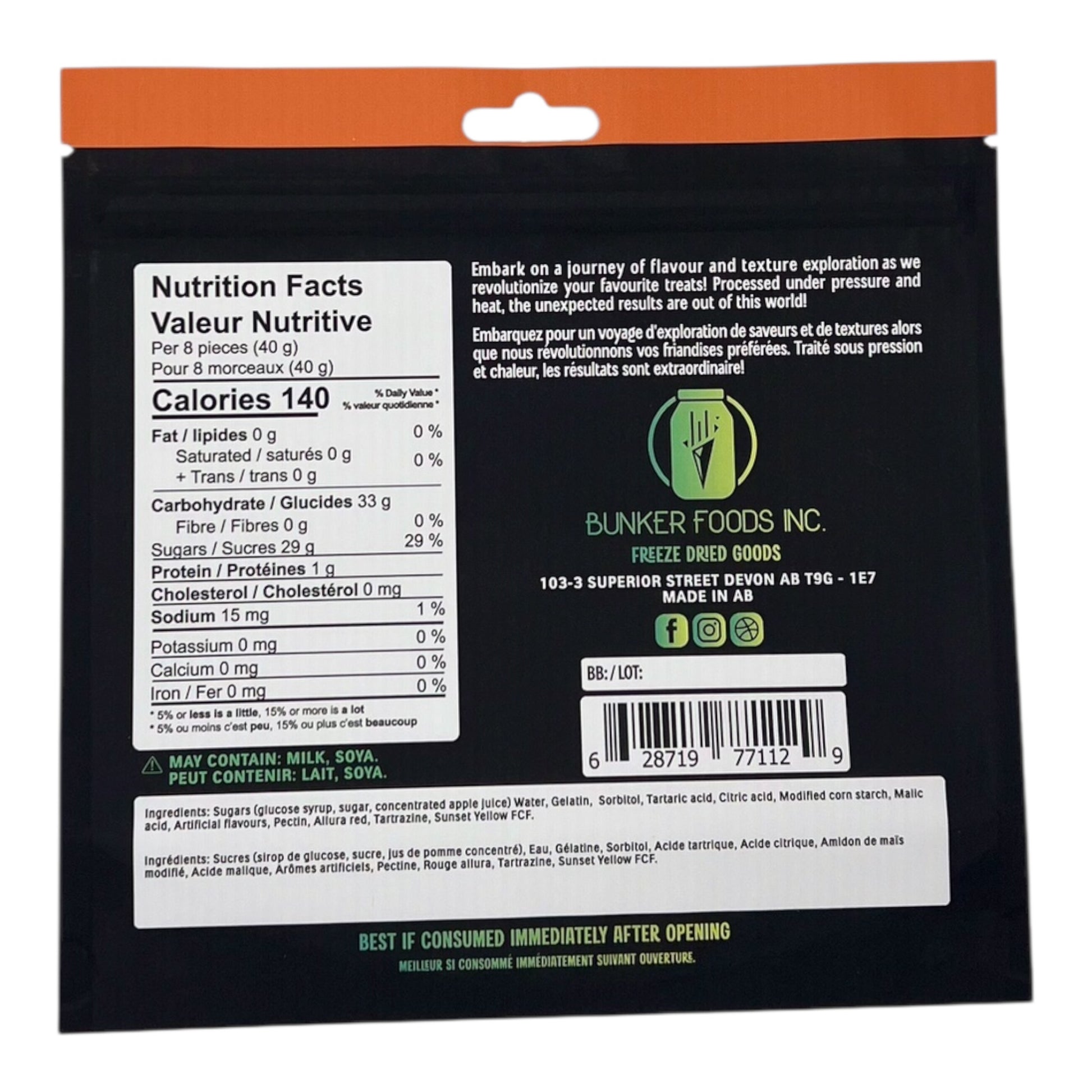 INGRÉDIENTS: Sucres (sirop de glucose, sucre, jus de pomme concentré), Eau, Gélatine, Sorbitol, Acide tartrique, Acide citrique, Amidon de mais modifié, Acide malique, Arômes artificiels, Pectine, Rouge allura, Tartrazine, Sunset Yellow FCF.