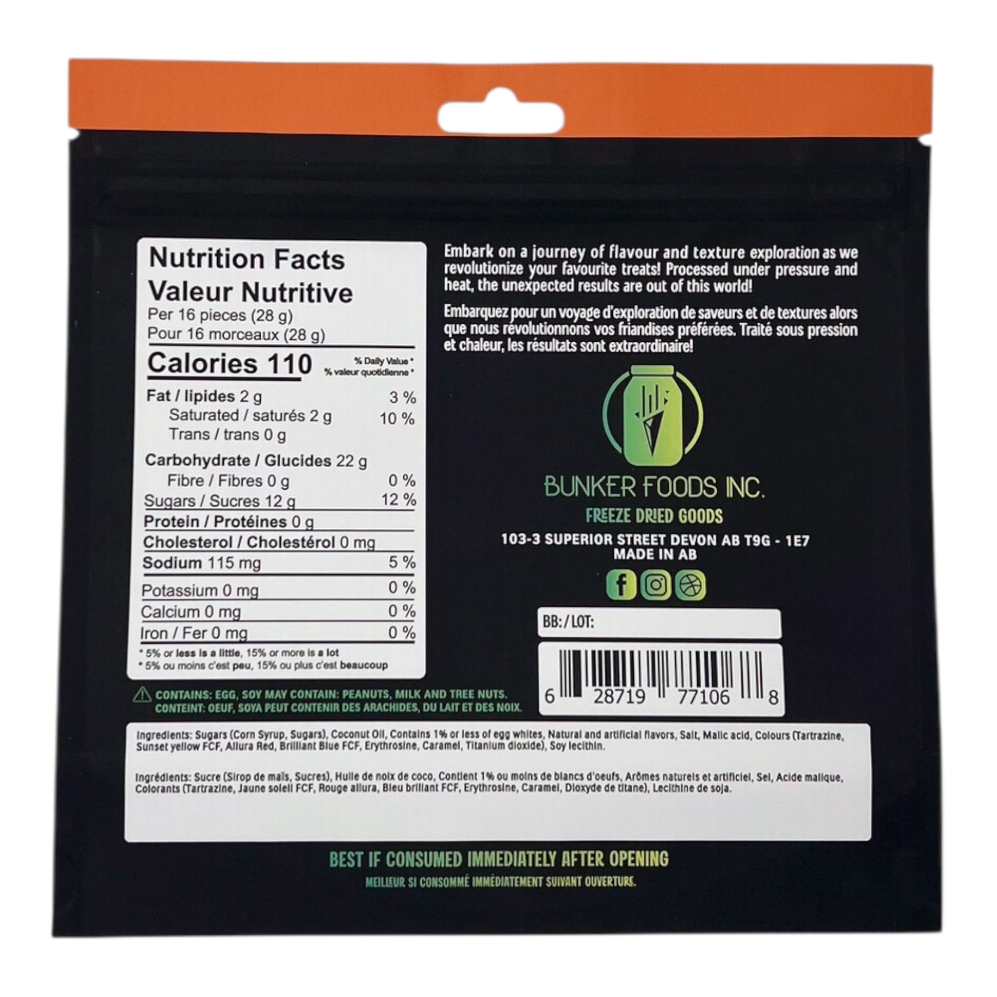 Ingredients: Sucre (Sirop de maïs, Sucres), Huile de noix de coco, Contient 1% ou moins de blancs d'oeufs, Arômes naturels et artificiel, Sel, Acide malique, Colorants (Tartrazine, Jaune soleil FCF, Rouge allura, Bleu brillant FCF, Erythrosine, Caramel, Dioxyde de titane), Lecithine de soja.