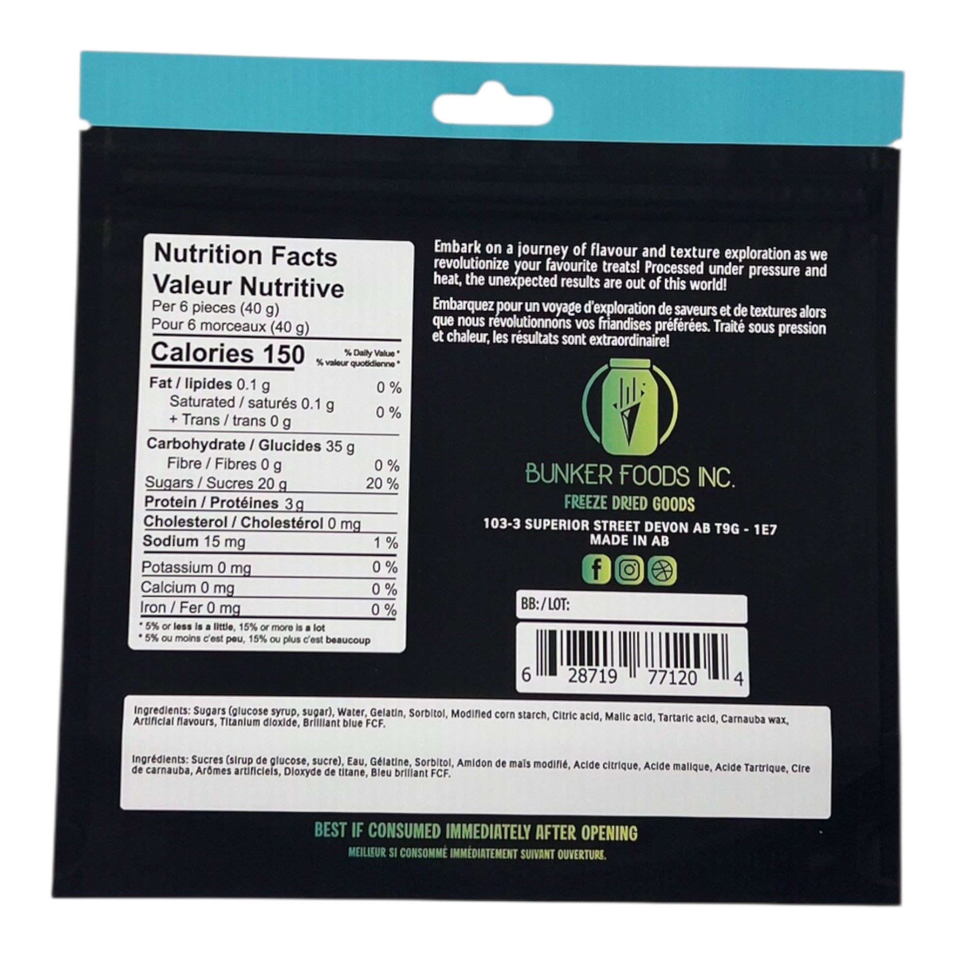 Ingrédients: Sucres (sirup de glucose, sucre), Eau, Gélatine, Sorbitol, Amidon de maïs modifié, Acide citrique, Acide malique, Acide Tartrique, Cire de carnauba, Arômes artificiels, Dioxyde de titane, Bleu brillant FCF.