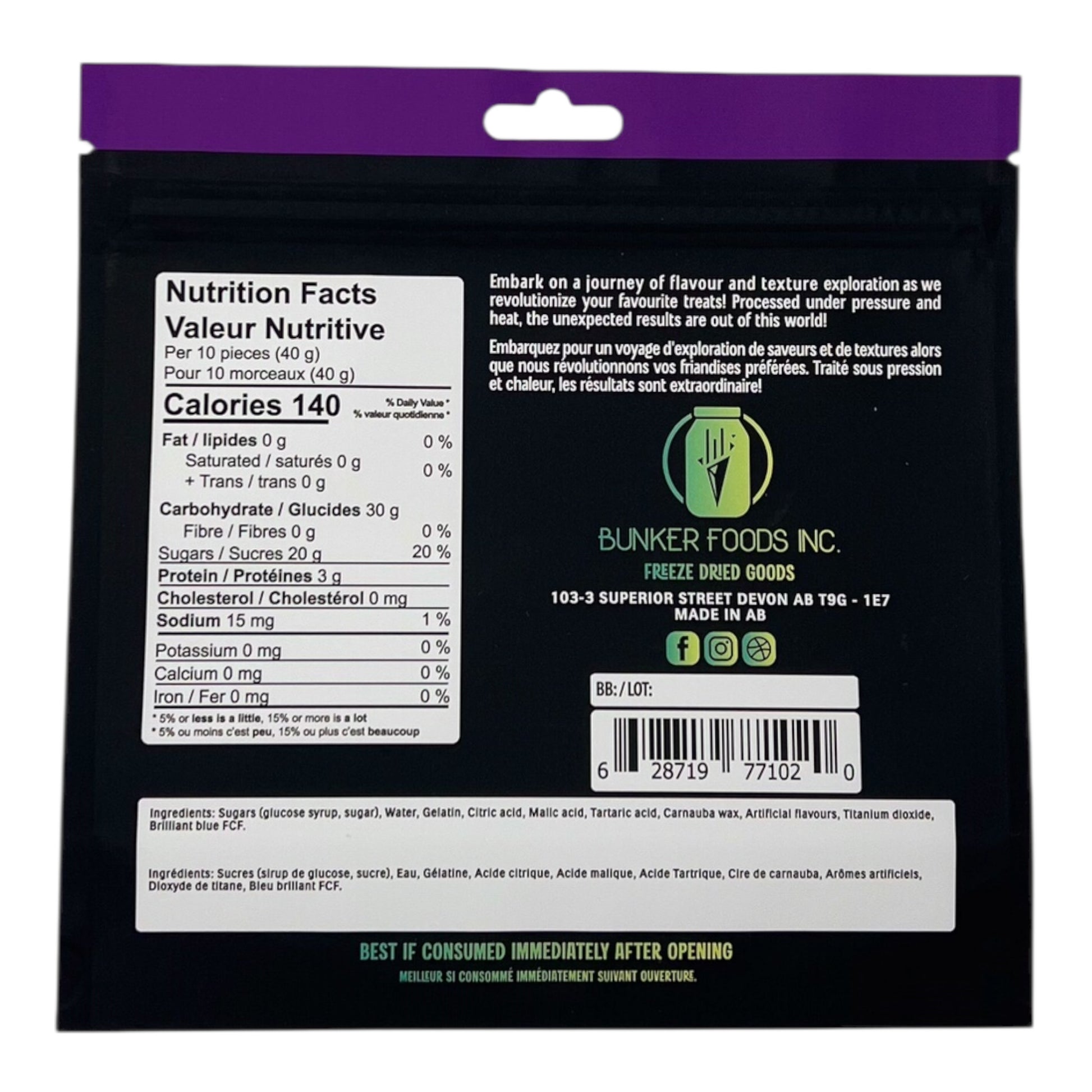 Ingrédients: Sucres (sirup de glucose, sucre), Eau, Gélatine, Acide citrique, Acide malique, Acide Tartrique, Cire de carnauba, Arômes artificiels, Dioxyde de titane, Bleu brillant FCF.